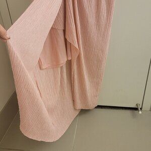 Gorgeous cinched waist midi dress, perfect for summer weddings and events. Richly textured in plissé pleats, this midi dress has a wrap look about it with a surplice neckline and a split at the skirt converging at a center twist knot.