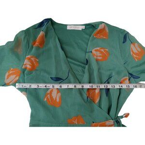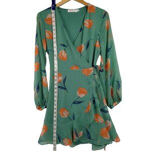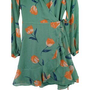 All In Favor Wrap Mini Dress Womens S Green Floral Long Sleeve Feminine Flirty