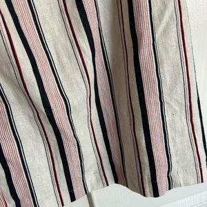 All In Favor linen striped dress in red, white and blue. Straight cut across chest, loose fit thru bodice, adjustable spaghetti straps and lovely linen fabric.