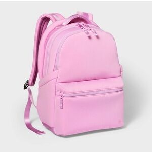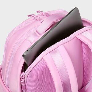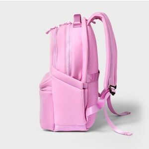Designed for school and travel, this versatile backpack is crafted from flexible faux neoprene that moves with you. It features a 14L capacity and comfortably fits up to a 16” laptop, with both interior and exterior pockets for easy organization. A water-bottle pocket, water-repellent finish, top handle, and adjustable backpack straps make it practical and comfortable for everyday use. Easy to spot clean or wipe down.