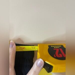 Size Small 17” Waist 12” Rise 32" Inseam 2 front slip pockets Single button Hidden zipper side pocket Elastic drawstring waistband Nylon/Spandex blend 200 Stock photos for fit reference only. The pants you will receive are black.
