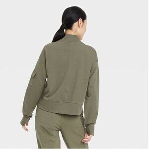 All In Motion French Terry Butter Wash Sweatshirt Size in Army Green XXL. Cotton-blend terry fabric that’s butter washed for unrivaled softness gives you super comfortable day-to-day wear. The midweight construction and ribbed hem, cuffs and neck give this sweatshirt a cozy feel, and a hint of spandex adds just enough stretch for free movement. Thumbholes help keep your hands warm when you’re not wearing gloves, and the cropped silhouette and patch pocket on the sleeve add fun, casual style.