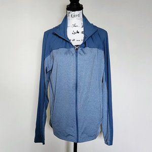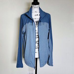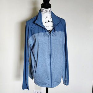 - Light blue-gray color with contrasting darker blue on top 1/3 of jacket and down sleeves