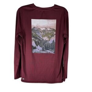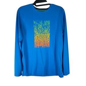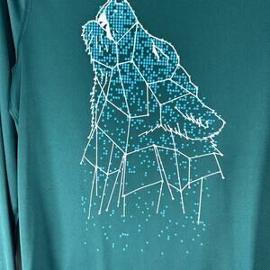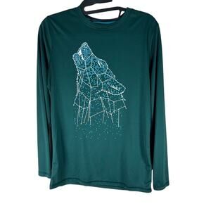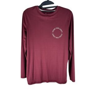 Three-shirt All In Motion bundle in size XL 16 featuring moisture-wicking recycled polyester fabric. Includes maroon shirt with “Push The Limit” chest graphic, blue shirt with pixel gradient “Next Round” graphic, and green shirt with geometric wolf graphic. Lightweight long-sleeve athletic tops ideal for sports, training, or layering. Condition consistent with age and use. Please review pictures for details.