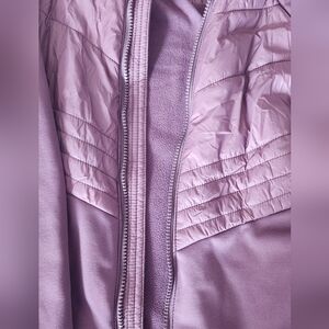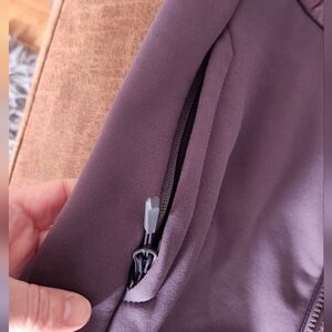 This jacket features soft curves that contour to the shape of your body to move with you as you stretch and flow. A full-length zipper offers as much coverage as you like, and it's concealed by a zipper garage for comfortable wear. Thumbholes keep the sleeves in place and keep your hands warm, and the knit fabric lends a soft, smooth feel for year-round wear. Secure side-entry pockets provide safe storage and maintain a sleek shape when closed. Interior pocket for valuable storage.