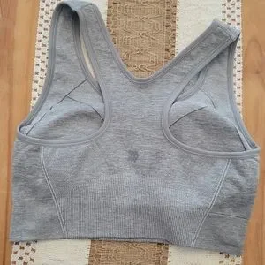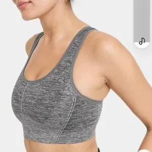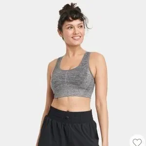 All In Motion Seamless Medium Support Racerback gently used size large. The bra has removable pads. The material is 67% Nylon, 27% Polyester and 6% Spandex. Does come from a pet friendly home.