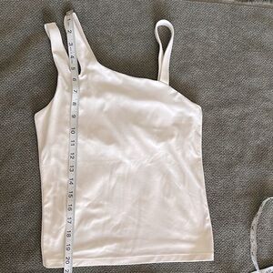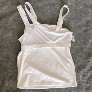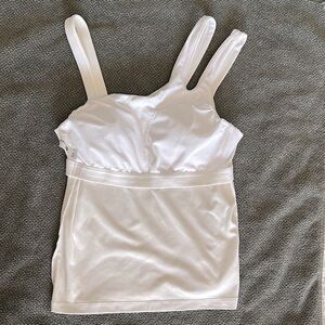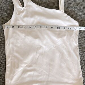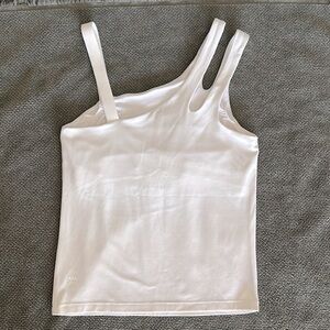 Cute asymmetrical straps for a fun twist on a white tank. Has a built-in bra and removable pads.
