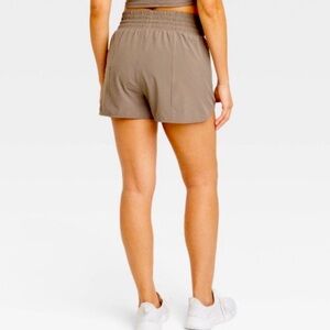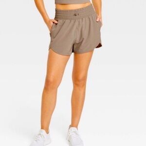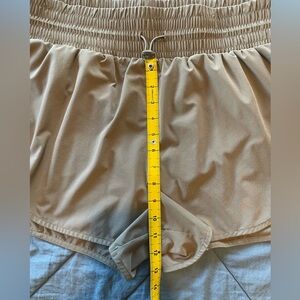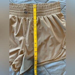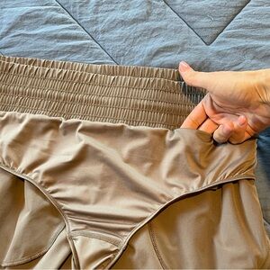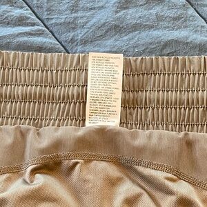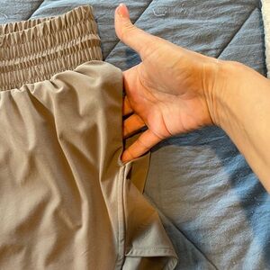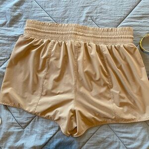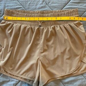 Tan/Brown hiking or running shorts with multiple pockets. One exterior zipper pocket. One interior zipper pocket. And another exterior non-zipper pocket. Draw string and interior liner.