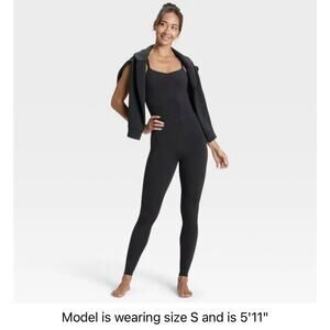 The All In Motion Women’s Everyday Soft Active Bodysuit in size Small is designed for comfort, flexibility, and style. This sleek black one-piece jumpsuit features a flattering regular fit with an ankle-length cut, perfect for yoga, jogging, gym sessions, or casual wear. Crafted from a midweight nylon-blend with spandex, it provides excellent stretch and freedom of movement. Details include built-in shorts, a trendy keyhole V-back, and adjustable straps for a secure fit. Easy to layer or wear solo, this versatile piece transitions from workouts to loungewear effortlessly.