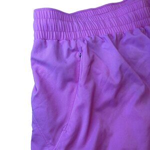 All In Motion Women's Light Pink Athletic Running Shorts. Designed for both function and fashion, these shorts are ideal for activities such as running, cross-training, and gym workouts. The elastic closure ensures a snug, size medium. Small stain near the zippered pocket, pictured.
