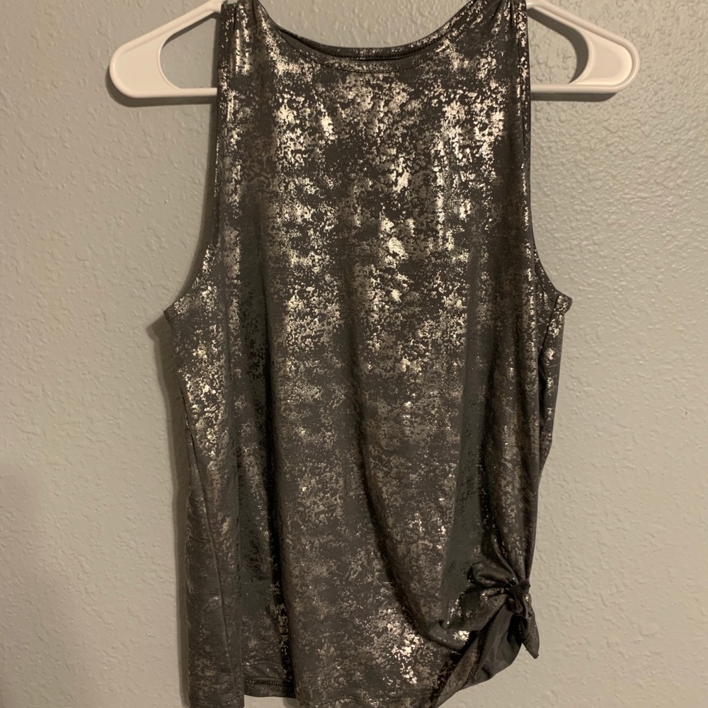 Selling my All In Motion workout tank top. Cute silver design all over. Tie on side of top (as seen in picture). Never worn.