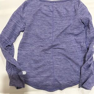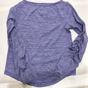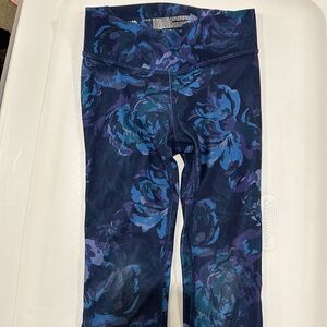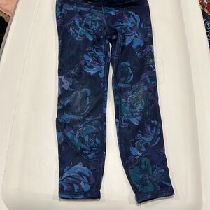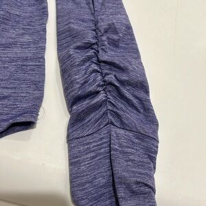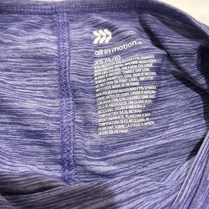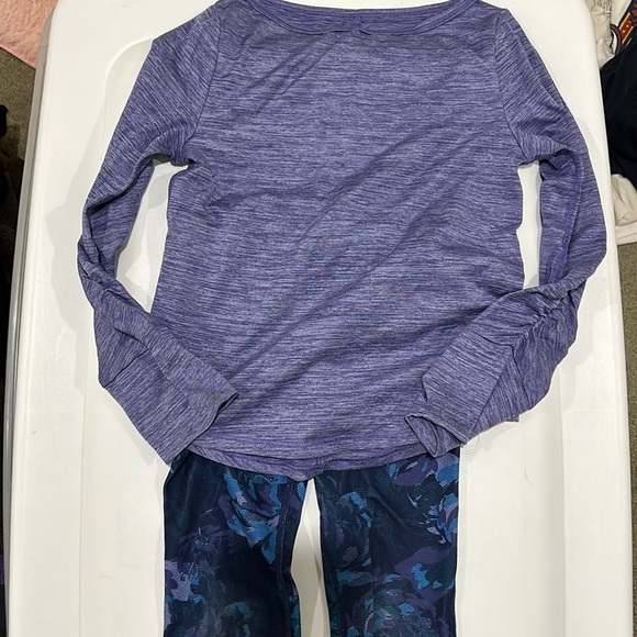 All In Motion outfit. Purple top with shirred sleeves and thumb holes. Navy leggings with blue and purple flowers. Polyester and spandex.