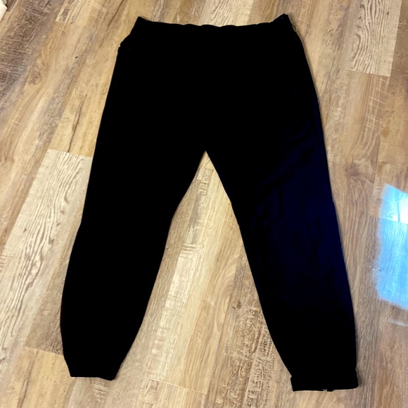 Lightweight material,2 pockets on sides, elastic waist band,small torn on waist band took pictures, good condition