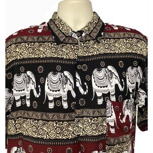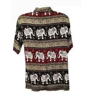 All Over Graphic Elephant Print Mens Button Up Camp Shirt Large Pocket Cotton - Tag Indicates XL - Shirt Measures Large - See Measurements. Great Pre-Owned Condition Gently Worn. Ships from smoke free home.
