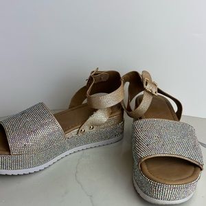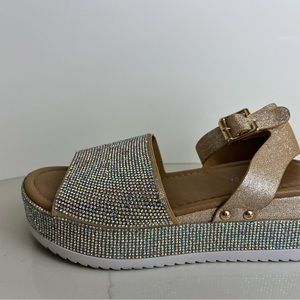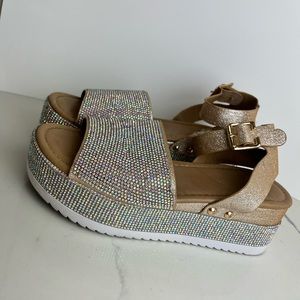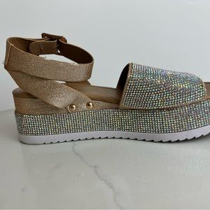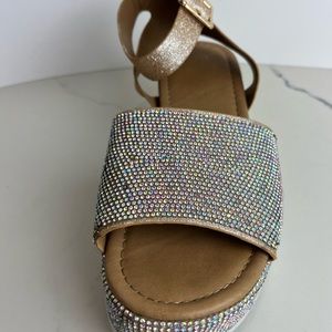 No rhinestones are missing. A little wear on one ankle strap. Super cute sandal! Dresses up any outfit.