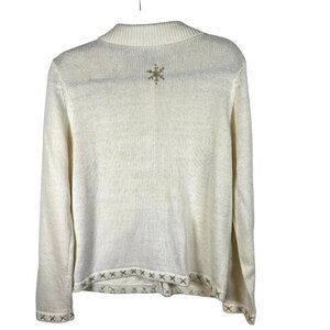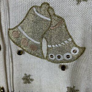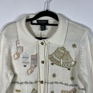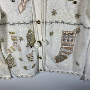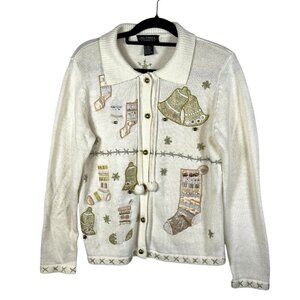 All Points Christmas Cardigan Bells Stockings Knit Cream Women’s Size Medium