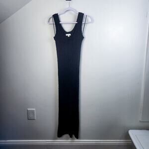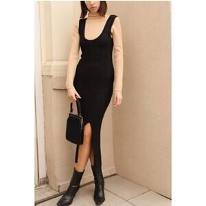 - Description: Black chunky knit tank dress; midi length; slit at front side; stretchy material; very fitted style dress