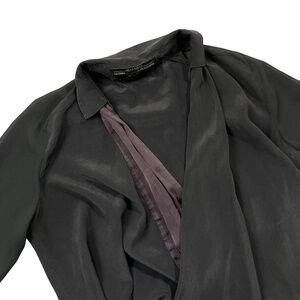 All Saints 8 Black Blouse Cross Body 100% Silk Purple Trim Long Sleeves