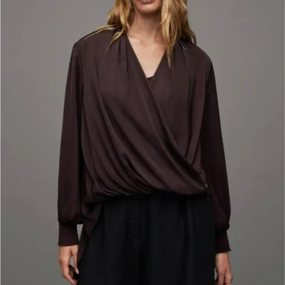 All Saints Abi Sleeve Draped Wrap Over Top Size 8 Purple V-Neck Silky Blouse