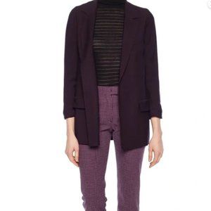 Menswear-inspired blazer with a a lengthy silhouette and open front