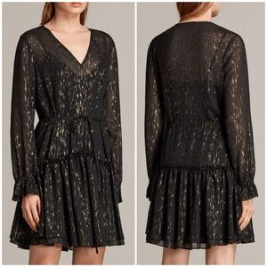 All Saints Alia Gold Metallic Flecked Black Ruffled Tie-Waist Mini Dress Medium