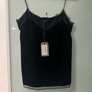 Chic black velvet camisole with delicate lace trim. V-neck design. Perfect for layering or wearing alone. New with tags.