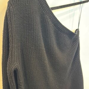 Embrace modern elegance with this All Saints off-the-shoulder sweater, showcasing a sleek black hue and a unique asymmetrical design. Crafted from a soft knit fabric, it offers a minimalist style perfect for casual outings. The diagonal neckline adds a touch of sophistication to this contemporary piece.