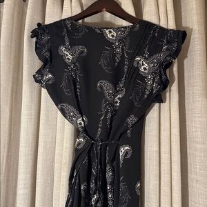 Chic mini dress with a paisley pattern. Features ruffled sleeves and a wrap style. Perfect for a stylish outing.