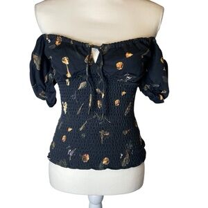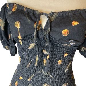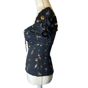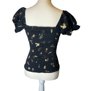 This stunning blouse features a deep navy blue fabric adorned with whimsical golden prints. The puff sleeves and smocked bodice create a fitted silhouette, while the tie front detail adds a delicate touch to the neckline.