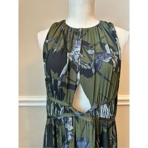 Elegant maxi dress with botanical print. Features green and purple hues. Sleeveless design with a stylish cutout.