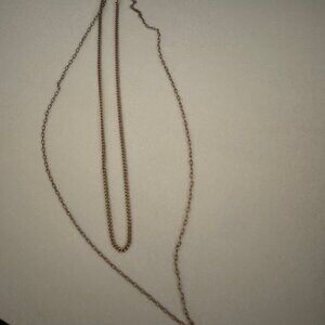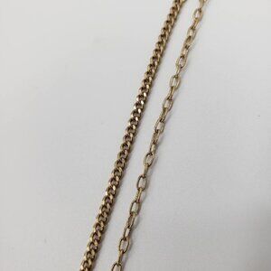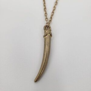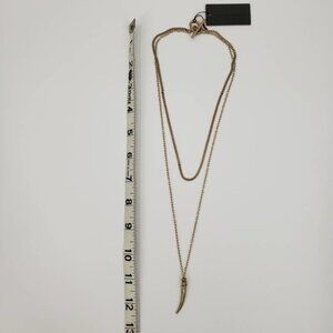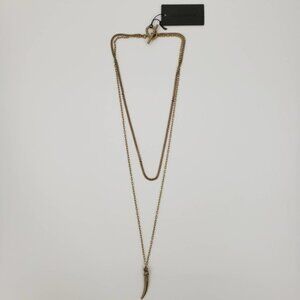 It's a multi-layer brass tone necklace with a horn pendant and a toggle closure