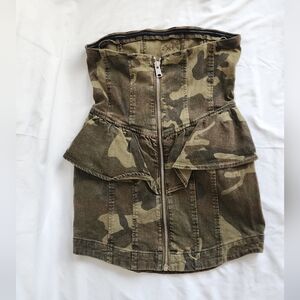 Stylish strapless olive green dress featuring floral embellishments. Perfect for a chic look.
