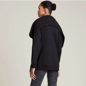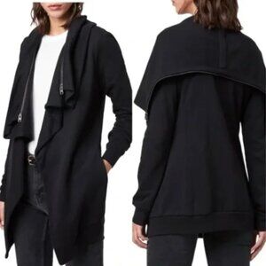 All Saints Dahlia cascade, zip color cardigan/sweatshirt in black women’s size small. This versatile piece can be worn with the cascade front or open as a shawl collar. In good preowned condition… no pilling or pulls.
