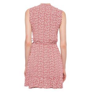 Red 'Krystal' sleeveless dress from AllSaints. Tie fastening on the front. Decorated with a printed pattern in cream. Bottom hem trimmed with ruffles. V-neck.