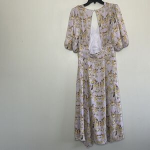 Elegant midi dress with floral pattern. Features puff sleeves and open back. Perfect for any occasion.