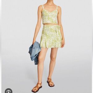 Dainty floral print adorns this flowy miniskirt cut from a lightweight fabric and finished with a flowy side tie belt and flouncy hem.
