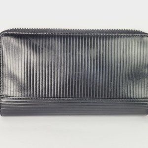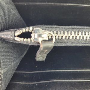 AllSaints HEIDY Black Textured Ribbed Striped Leather Zip Around Wallet. This used wallet is in overall great condition with only normal signs of wear. Please note that the inside zipper does not close completely (it appears this is endemic to this model because other pictures of this wallet have shown the same thing). Also, the zipper is not quite smooth to open and close, which may also be a particular feature specific to this brand or model? It measures approximately 8" across and 4.25" tall.