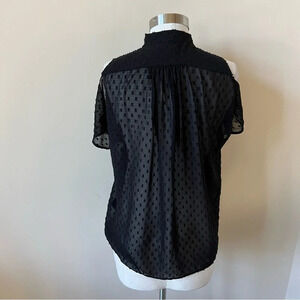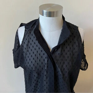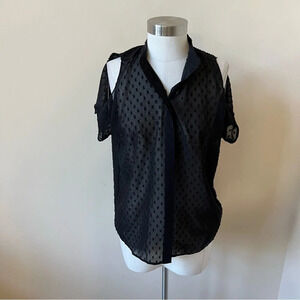 Black sheer swiss dot fabric button down shirt with open cold shoulders. Excellent condition