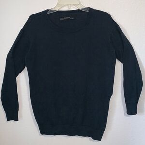 Gorgeous deep navy crew neck pullover sweater with slits / vented sides. Cotton/silk blend. One side of the neck tag is loose/free but otherwise Sweater is in excellent condition with no flaws. Rare and hard to find color!