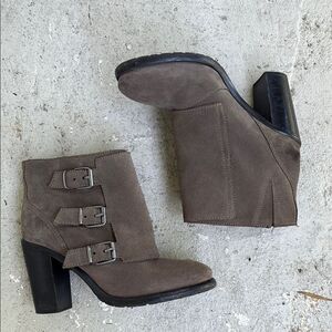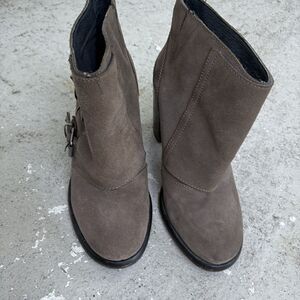 Please look at the pictures. These are super cute and comfortable but as you see from the pictures both boots on the inside he needs some cleanup. Heel height is 3.5 inches shaft height is 4.5 inches. Width is 5.25. Color is like a grey taupe.
