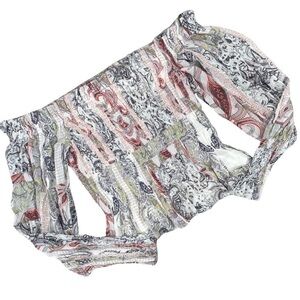 A boho-inspired paisley print animates this shoulder-baring smocked top framed by billowy long sleeves. Smocked bodice is lined giving it additional structure.