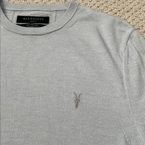 Elegant All Saints sweater crafted from merino wool. Soft gray hue adds sophistication. Small hole in left sleeve near cuff. See pic