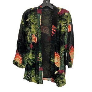 Stylish kimono jacket with vibrant patterns. Features a mix of green, red, and black. Perfect for layering.