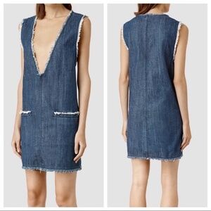 All Saints Reika Denim Jumper Dress w/ Plunging Neckline & Distressed Edging ~ Size 8