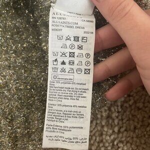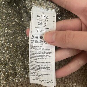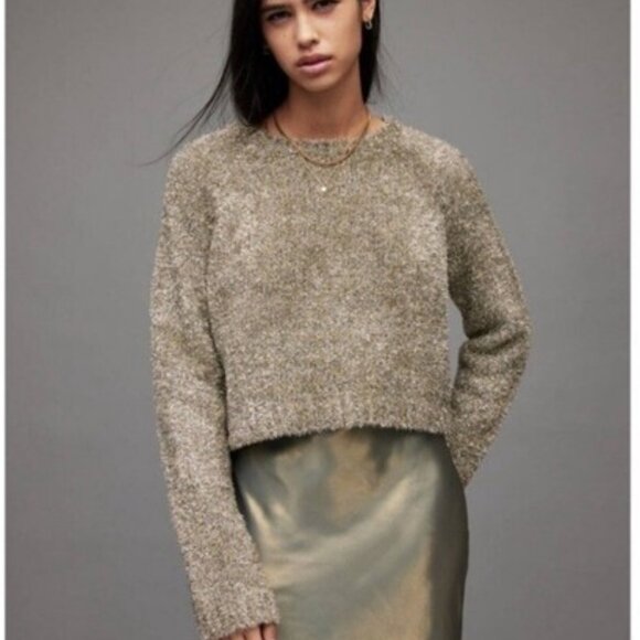 Crew neck, holiday tinsel style knit, gold silver color, cropped length, perfect for new years or a Christmas party, all saints sweater