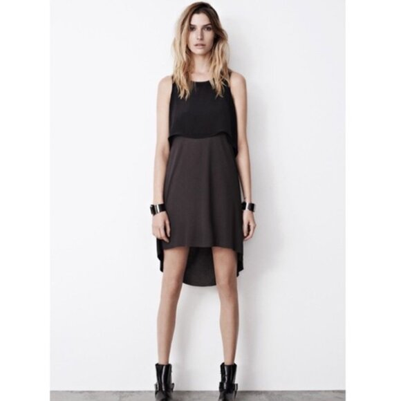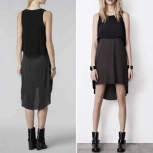 All Saints Rubik Silk Blend Hi Low Black Grey Overlay Shift Dress