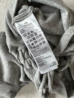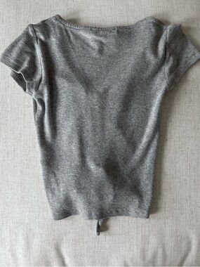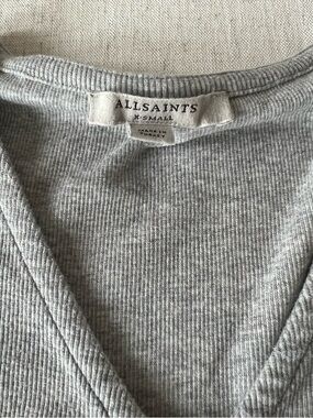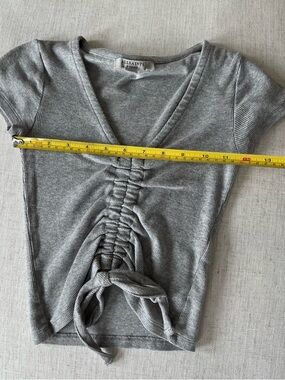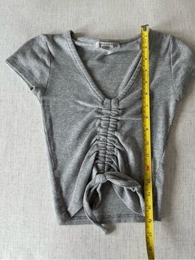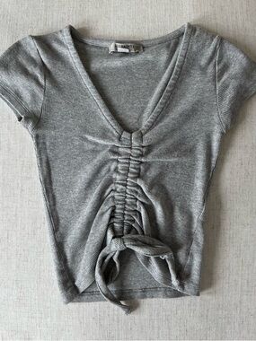 All Saints grey short sleeve top with a v-neckline, ruching down the center and a tie detail