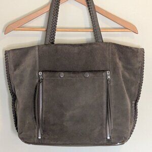 All Saints suede tote bag with three interior compartments. Shoulder strap with woven detail.