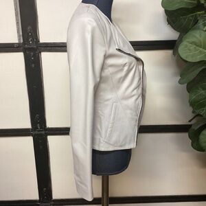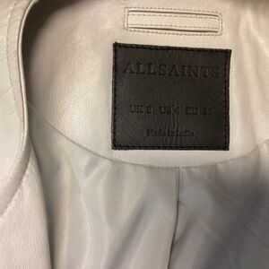 This Allsaints lamb leather jacket is mordern looking, crop style, size 4 but feels like XS, if you need wear size S, this is not the right size. The England size is smaller. pockets on both side. In great condition, I only wore a couple of times.
