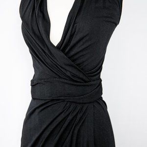 Plunging neckline wrap dress by All Saints with body flattering draping. Noir black color. Hook and eye closures at the waist. Material is Viscose, very soft and breathable. Size 00 Length 42 Waist 11.5” Pit to Pit 13” A small hole in the back that can be patched up easily.